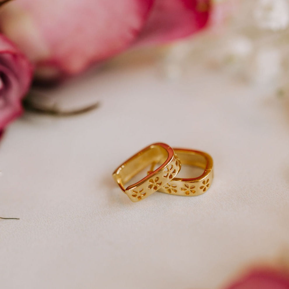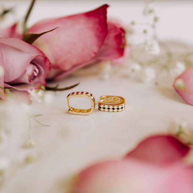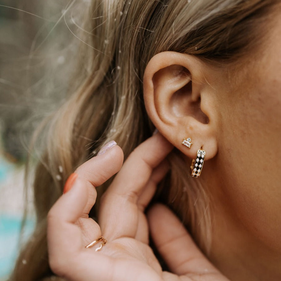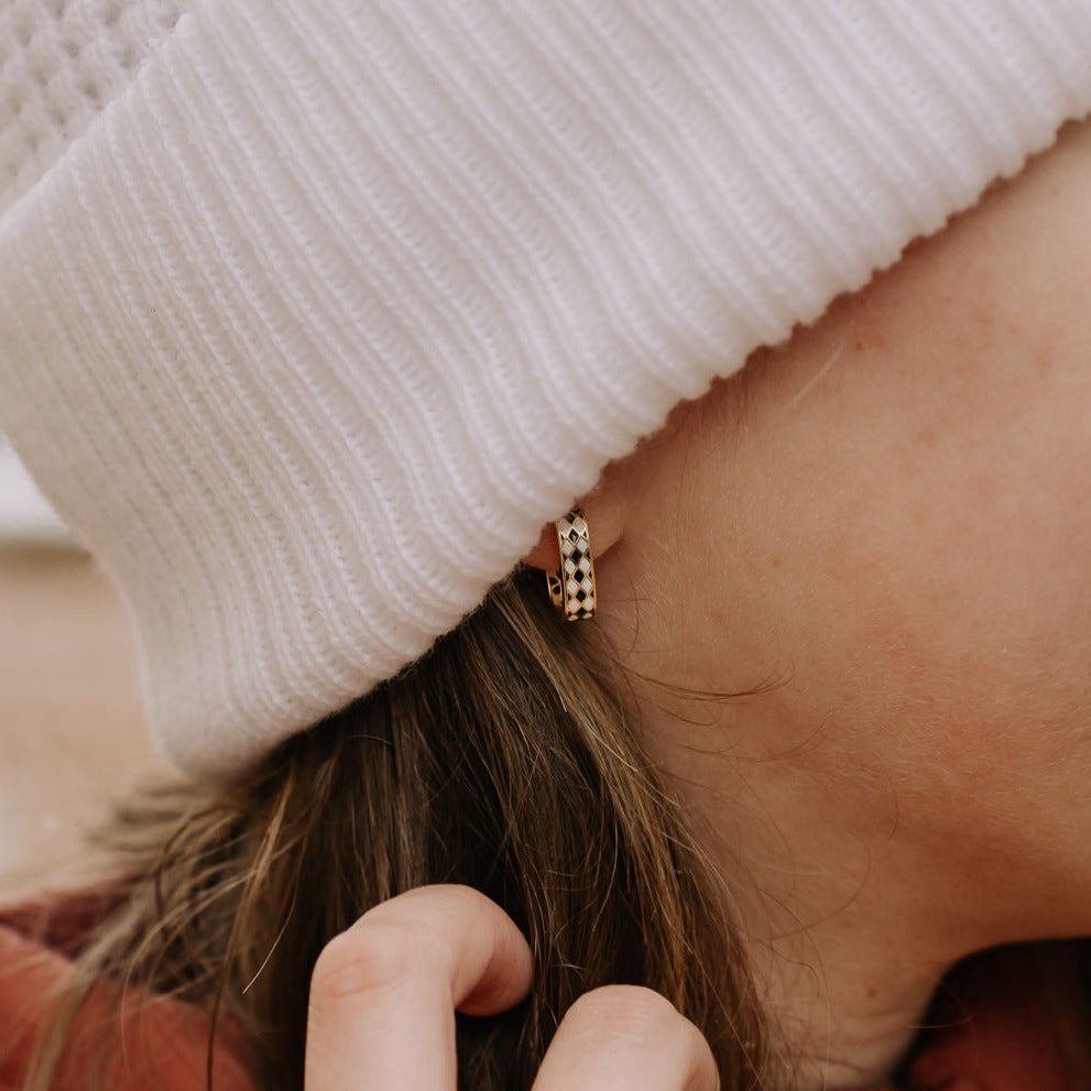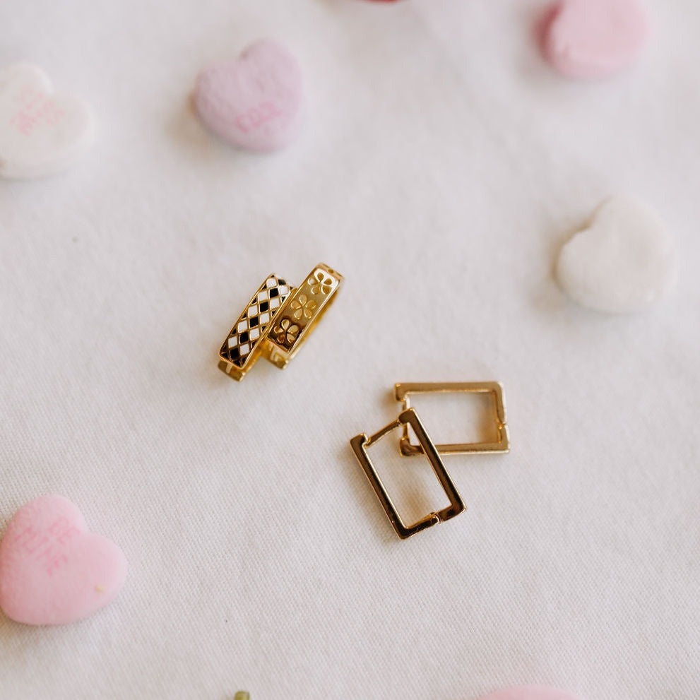 The Times Square Reversible Hoops are made of high quality gold vermeil metal and are hypoallergenic and good for sensitive ears. On the front side they feature a unique black and white diamond checker pattern, and on the other side feature a dainty gold cutout daisy pattern. They can be worn in either direction, meaning you get two earring styles for the price of one! Outer diameter is 10mm.Â